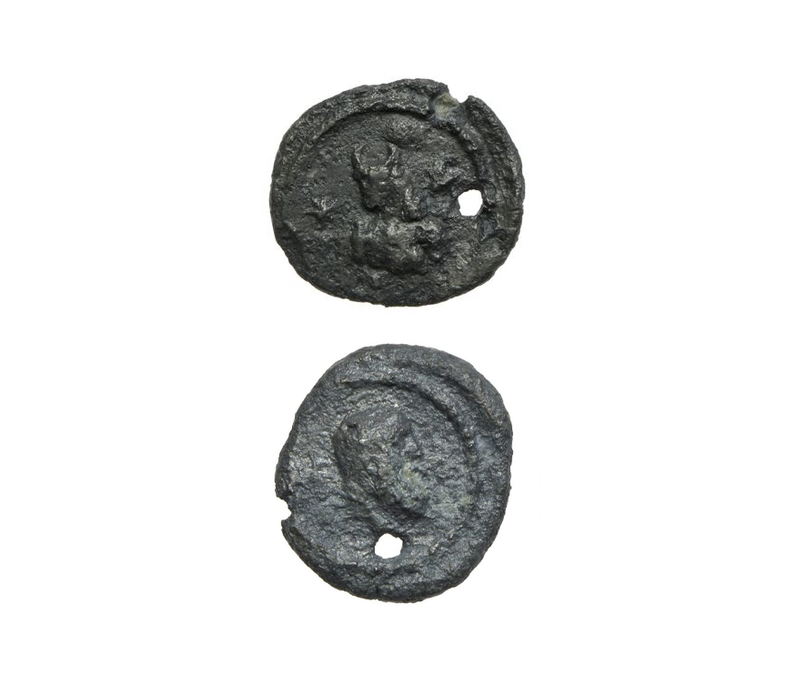 Lead token for a theatre performance. Three theatre masks on pedestals, inscribed Theophoroumene, Menander’s play.